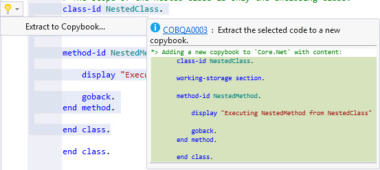 エディターの [Extract to Copybook] コンテキスト メニュー コマンドの代わりに、[Extract to Copybook] クイック アクションを使用できます。
