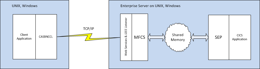 ECI のクライアント プログラムは、Enterprise Server と同じマシン上または物理的に異なるハードウェア上で実行できます。要求が、通信レイヤーを通して対象リージョンに送信されます。リモート サーバーにアクセスする場合、プログラムは Web Services and J2EE リスナーを介して接続します。下図は、TCP/IP を通してクライアントからリモート サーバーへの要求のパスを示しています。