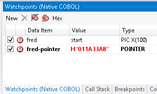 Notice that the Watchpoints window indicates the change by emboldening the data item and highlighting the changed value in red: