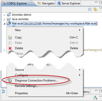 診断ツールはリモート プロジェクトおよびリモート接続のみで利用でき、Eclipse IDE 内から実行します。リモート プロジェクトを ([COBOL Explorer] で) 選択するかまたはリモート接続を ([Remote Systems Explorer] で) 選択します。次に右クリックして [Diagnose Connection Problems] を選択しツールを実行します。