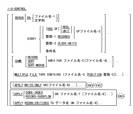 入出力管理段落では、再開点、ファイル間で共有する記憶領域、複数ファイル リール中の順編成ファイルの位置を指定する。