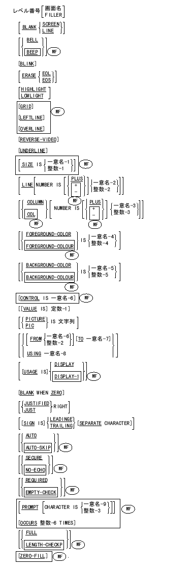 - 画面記述は、画面上の領域を定義する。各記述項は、レベル番号といくつかの句で構成する。画面名をはじめとする各種の句は、指定しても指定しなくてもよい。これらの句を通じて、項目の位置や操作卓機能を記述する。