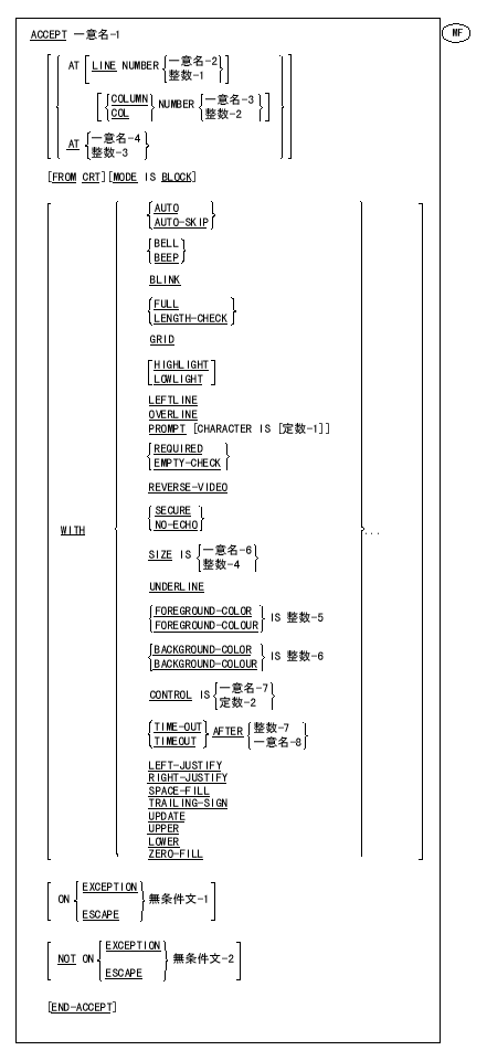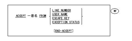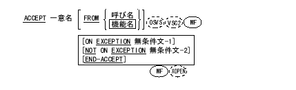 ACCEPT(受取り)文は、操作卓からキー入力されるデータ、またはオペレーティング システムから提供されるデータを、指定されたデータ項目に入れてプログラムで利用できるようにする。