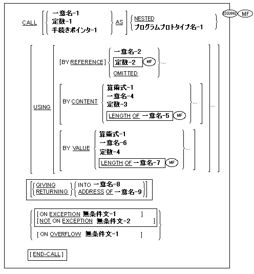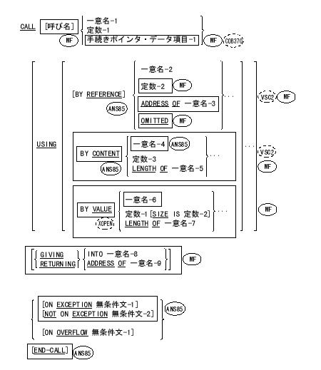 星印(*)の付いている構文規則はCALL文およびCHAIN文に共通である。それらの規則を「CALL文」または「CHAIN文」に適用するさいには、「CALL文」または「CHAIN文」を読むべきである。