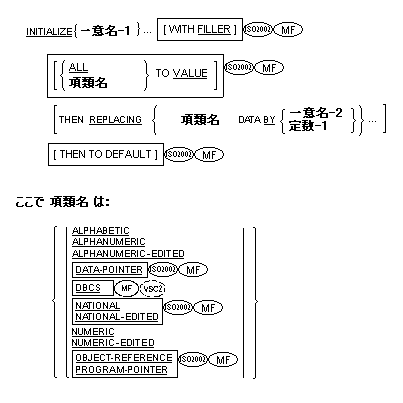 - 一意名-1と一意名-2が同じ記憶領域を指す場合には、INITIALIZE文の実行結果はどうなるかわからない。両者が同じデータ記述項に定義されていたとしても、そのことは変わらない。(手続き部の章の作用対象の重なり節を参照。)