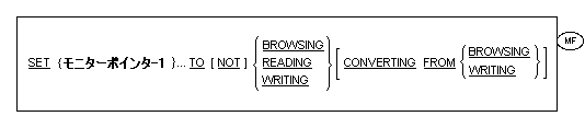 NOT指定を使用しない場合、モニターポインター-1 が参照するモニターの値は、BROWSING、READING、またはWRITINGのいずれかに設定され、これにより、対応する形式のロックが設定する。この特定のモニターに対するこの特定の種類のロックは結果として、一致するNOT指定または一致するCONVERTING FROM指定を含むSET文により解除されなければならない。