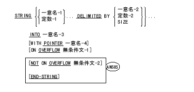 END-STRING指定はSTRING文の範囲を区切る。(COBOL言語の概念 の章の明示範囲符と暗黙範囲符 節を参照。)