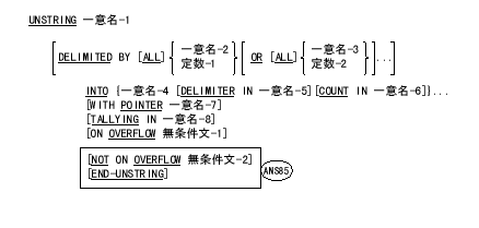 END-UNSTRING指定は、UNSTRING文の範囲を区切る。(COBOL言語の概念 の章の明示範囲符と暗黙範囲符 節を参照。)