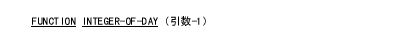 INTEGER-OF-DAY 関数は、グレゴリオ暦の日付をジュリアン日付(ユリウス暦)形式(YYYYDDD)から整数形式に変換する。この関数の型は整数である。