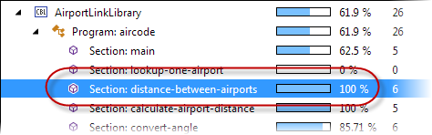 Section: distance-between-airports のコード カバレッジが 100% になっていることがわかります。