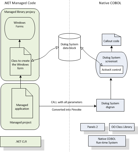 The Managed Customer + .NET WinForm sample ManagedCustomerWinForm.sln puts together the Managed Customer sample and the .NET Order Forms dialog that is used in the Customer + WinForm sample. These two together form a sample where all the COBOL is compiled to .NET and the Dialog System user interface remains in native code. The following diagram illustrates this.