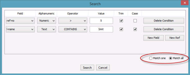 をクリックし、必要な演算子を選択します。デフォルトでは、指定したすべての条件に一致するレコードが結果に含まれます。