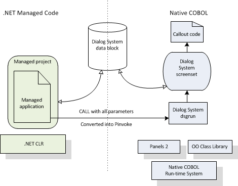 The Managed Customer sample ManagedCustomer.sln is broadly the original Customer sample that was supplied with Dialog System. The key difference with this sample is that it is compiled to managed code and run under .NET. The existing Dialog System run-time calls remain but are automatically converted to Platform Invoke calls into the native code. In other words, the user interface and screensets are all still running as native code. The following diagram illustrates this.