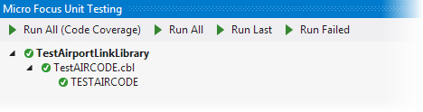 3. [TestAirportLinkLibrary] ノードおよび [TestAIRCODE.cbl] ノードを展開して、テスト ケース (TESTAIRCODE) を表示します。