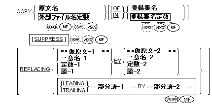 - COPY文を処理した結果は、予約語COPYに始まり句読文字の終止符で終わるCOPY文全体を論理的に置き換える形で、原文名によって表わされる登録集原文を原始文中に複写したようになる。