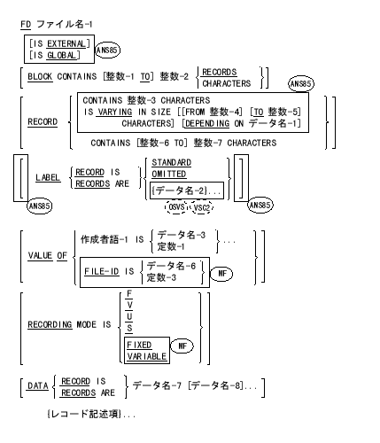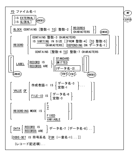 ファイル記述は、ファイル結合子、関連づけられたデータレコード、および関連づけられたデータ項目の内部属性および外部属性を決定する。また、ファイル名が局所名と大域名のどちらであるかも決定する。
