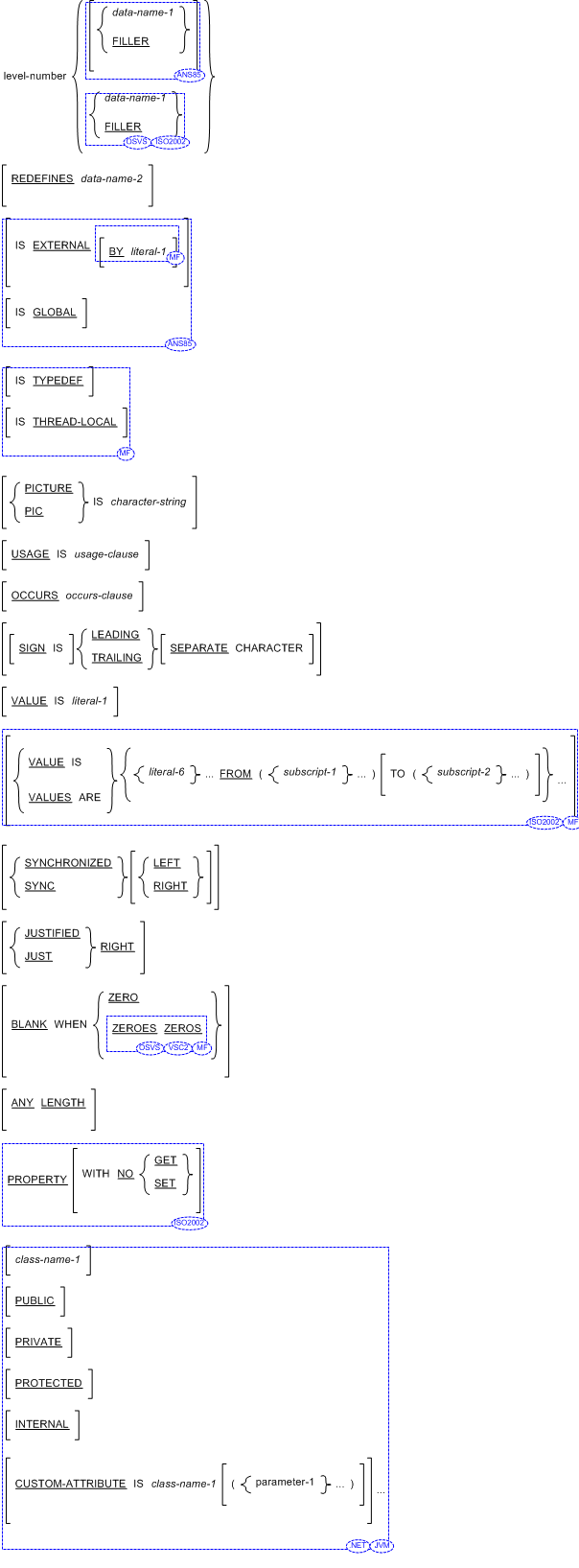 それらをレベル番号の直後に書く。REDEFINES (再定義) 句を指定するときは、データ名-1 または FILLER 句 が指定してあれば直後に書く。