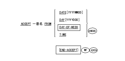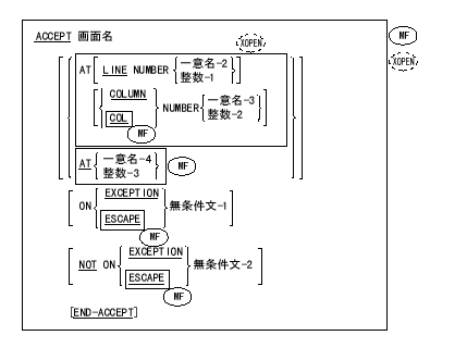 ACCEPT 文は、操作卓からキー入力されるデータ、またはオペレーティング システムから提供されるデータを、指定されたデータ項目に入れてプログラムで利用できるようにする。