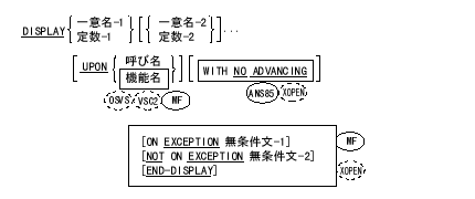 DISPLAY 文は、指定されたデータ項目のデータをCRT画面のような適切なハードウエア装置に転送させる。