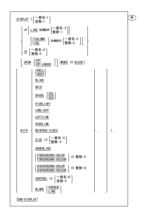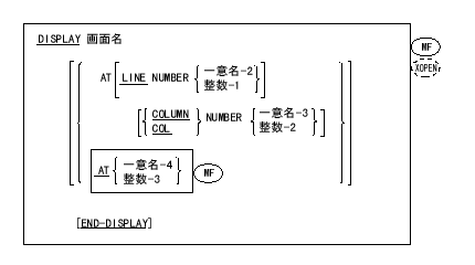 DISPLAY文はまた、プログラムからCRTまたはビデオ端末画面上の静止型定形画面にデータを転送して表示させる。表示されたその画面を、入力画面とすることができる。