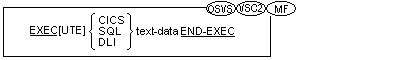 - 形式 EXEC(UTE) CICS、EXEC(UTE) SQL、およびEXEC(UTE) DLI により、適切なシステムコンポーネント(プリプロセッサ、コプロセッサ、外部コンパイルモジュールなどと呼ばれる)が呼ばれ、原文データを処理する。ただし、対応するコンパイラ指令が指定され、そのシステムコンポーネントを起動する場合に限る。対応するコンパイラ指令が指定されていない場合は、EXEC(UTE) 文が形式 1 EXEC(UTE) 文として扱われる。これらの形式の使用について詳しくは、COBOLシステムのマニュアルでCICSの使用およびデータベースへのアクセスについての情報を参照。