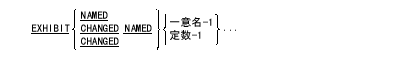 - EXHIBIT NAMED文を実行すると、指定した各一意名または定数が表示される。一意名の場合は、その名前(修飾語および添字があれば、それを含む)の後に"=" (等号)を付けて、その後ろに現在の値が表示される。表示される一意名または定数は、EXHIBIT文に指定された順番に、1行に並べられる。