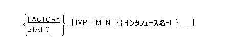 - IMPLEMENTS 句は、翻訳集団の概念の章のインターフェイスの処理系節に従い、親のクラスのファクトリオブジェクトにより使用されるインターフェイスの名を指定する。