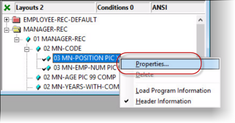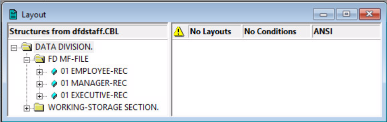 レコード レイアウト ファイルは、そのデータ ファイルを使用する COBOL プログラムのデータ部から作成できます。コンパイルされたプログラムから .idy ファイルを使用することで、フィールドがその目的のサイズにフォーマットされる構造化された方法でレコードを表示できます。