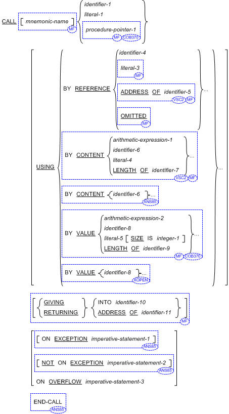 CALL 文を含むプログラムは呼び出し元プログラムである。呼び出し先プログラムが COBOL プログラムである場合、literal-1、または identifier-1 によって参照されるデータ項目の内容はプログラム名であって、呼び出し先プログラムのプログラム名段落に記述されているものでなければならない (「プログラム名段落」を参照、特に大文字と小文字の区別について)。