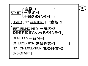 2. NOT ON EXCEPTION指定を使用した場合は、制御が無条件文-2に渡される。 その後、無条件文-2 で指定された各文の規則に従って、実行が続行される。手続きの分岐、または制御の移動を明示的に指示する条件文が実行された場合は、制御が文の規則に従って渡される。そうでない場合は、無条件文-2 の実行が完了すると同時に、START文の最後に制御が渡され、ON EXCEPTION指定が使用されていても無視される。
